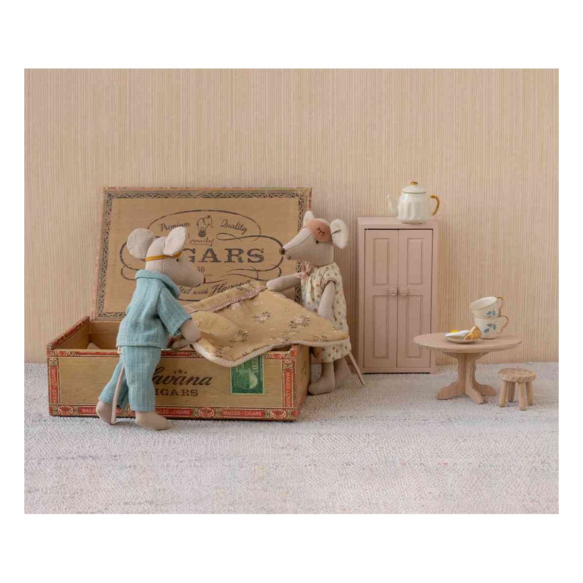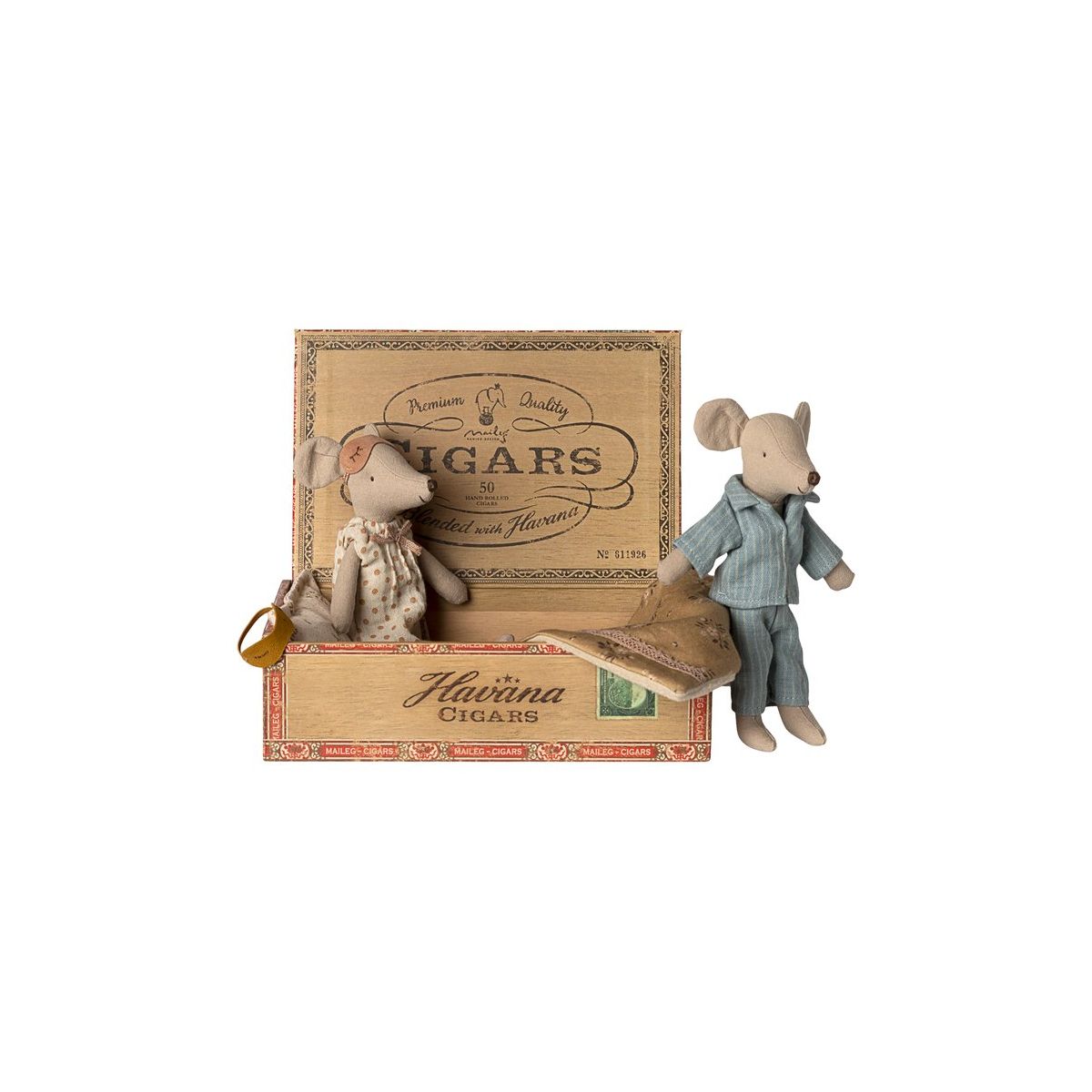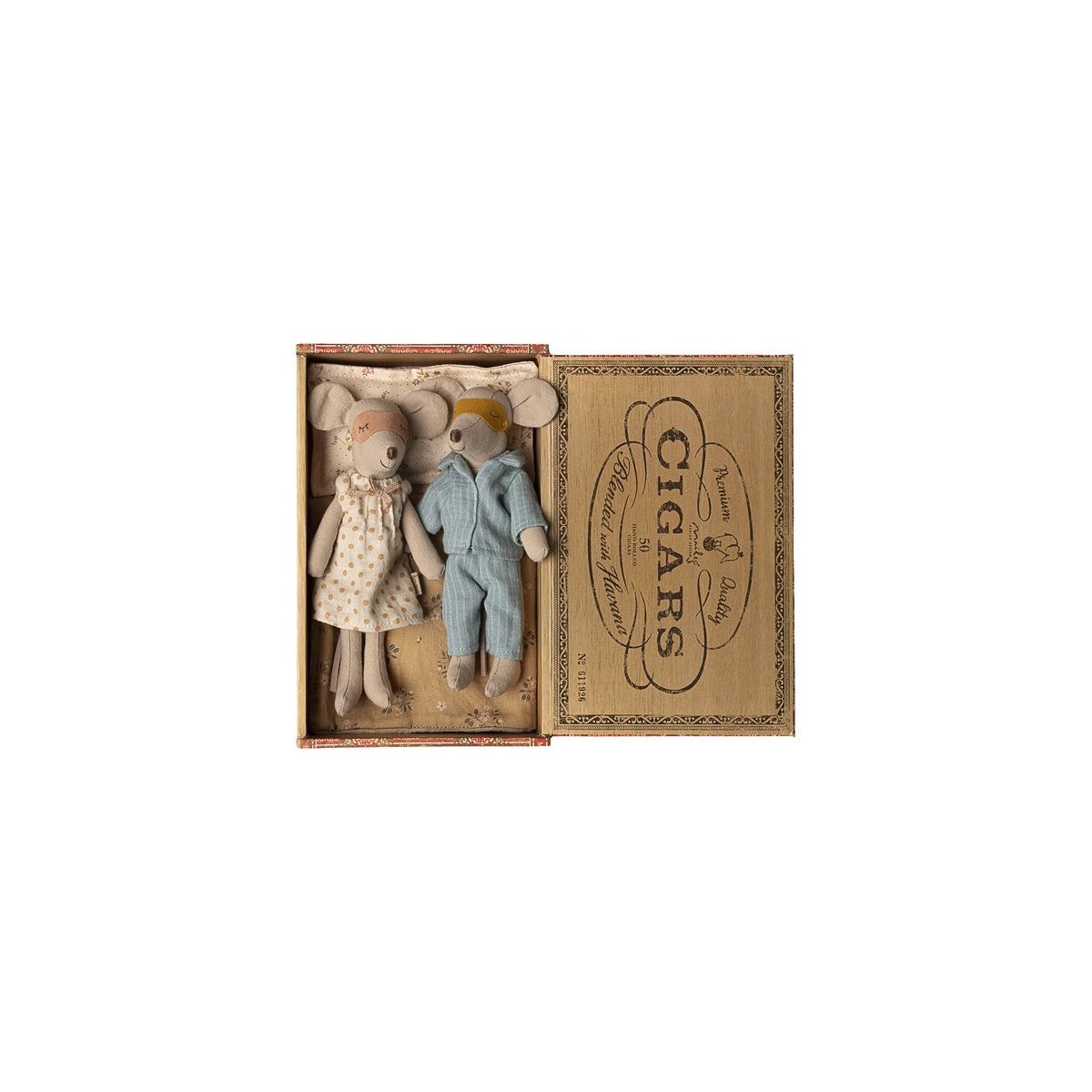 A classic Maileg item. Mom and Dad mice are wearing their beautiful nightwear and eye masks. The cigarbox is a perfect bed for a good night's sleep and sweet dreams.