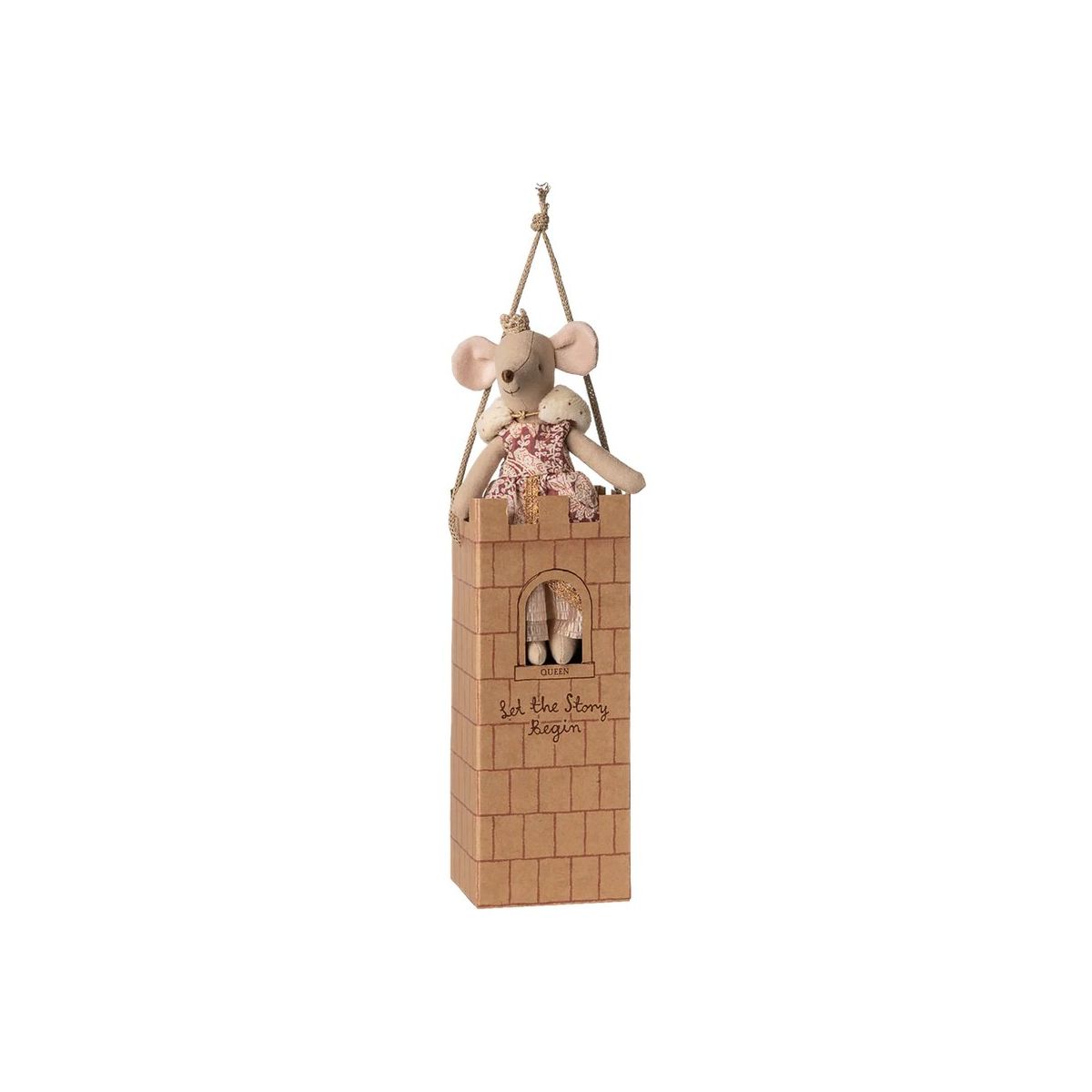 La ratoncita reina, del tamaño de mamá, está lista para ser la anfitriona en su castillo. Luce un precioso vestido y una corona reales, y encaja a la perfección en el salón del castillo.